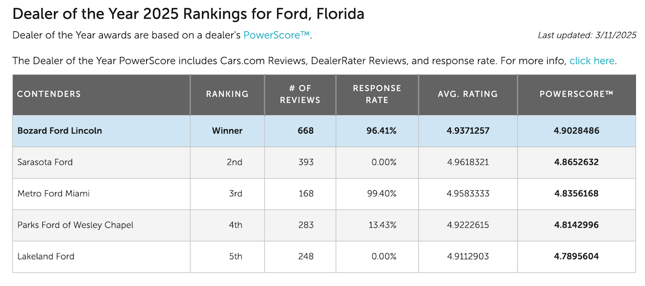 PowerScore™: The PowerScore™ calculation is based on both the dealer’s reviews, average rating, and review response rate which is used to rank dealers and determine the Dealer of the Year winner. For more information, click here.