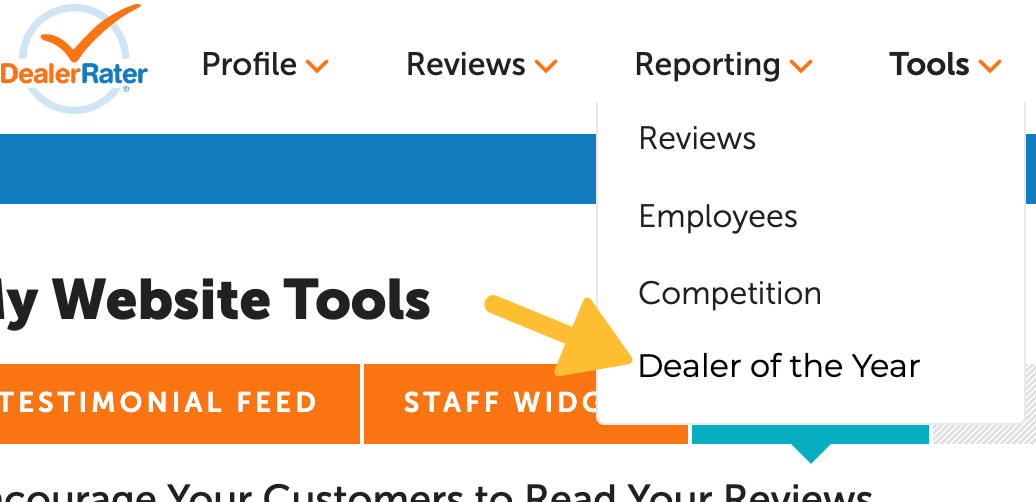 Hover over the Reporting tab in the top navigation and select Dealer of the Year from the drop-down.
