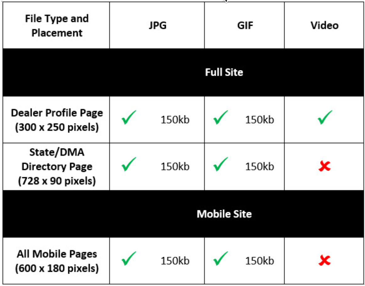 There are three primary advertising placements available on DealerRater, each with it's own size and specifications. Every Certified dealer gains access to the advertising space on their Dealer Profile Page, and all advertising placements owned on DealerRater include access to the mobile format advertising space at no additional cost. Additional advertising placements, such as advertising on Service Profile or Directory pages, may be available as part of an upgrade. Please see the chart above, with details following, for more information about advertising placements, specifications, and files available on DealerRater.
