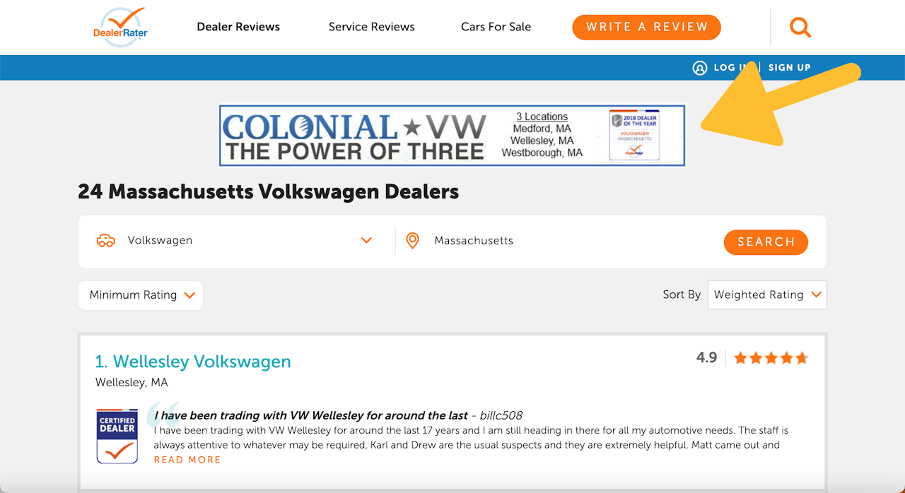 DealerRater directories are divided up by brand of vehicle, and by State, City, or zip/postal code - for example Volkswagen dealers in Massachusetts. Every directory page has an advertising space at the top of the page, with dimensions of 728 x 90 pixels. Advertising owned on these pages is often referred to as State Banner ads (for State Directories) or DMA Banner ads (for zip-code targeted DMA directories.) As with Dealer Profile Pages, unowned advertising spaces may display targeted ads from online ad services.