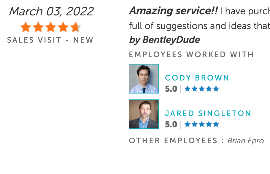 An Employee ratings contains all review scores the employee was tagged in, just like dealership ratings; However, newer ratings have more weight than older reviews.