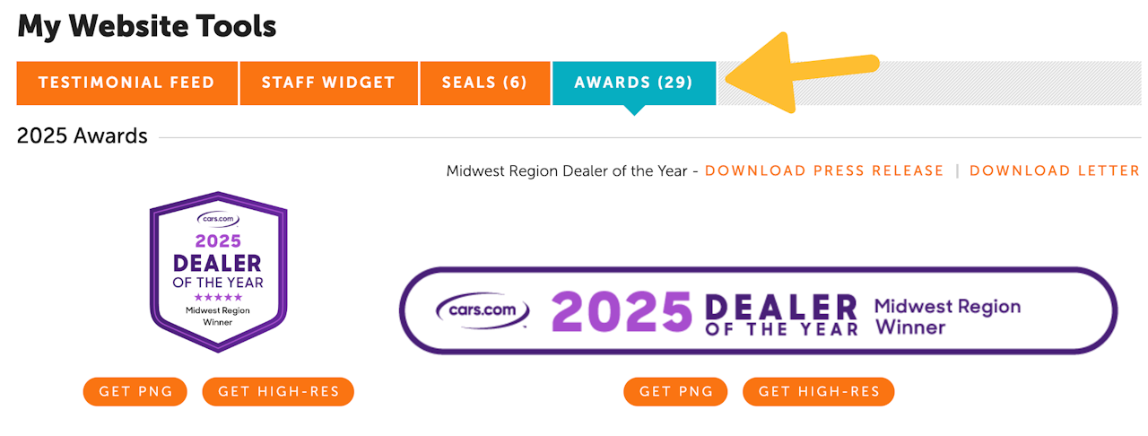 Click on the links for the “Download Press Release” or “Download Letter” to access the press release templates or Congratulations letter for each award that your dealership has received. To download a Dealer of the Year badge or banner graphic, click the Get PNG or Get High-Res button below the desired graphic.