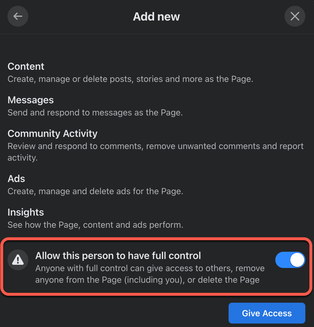 Next, the following permission screen will appear. You need to scroll to the bottom, toggle Full Control, and then select "Give Access." You will be prompted to put in your Facebook password to confirm the request.
