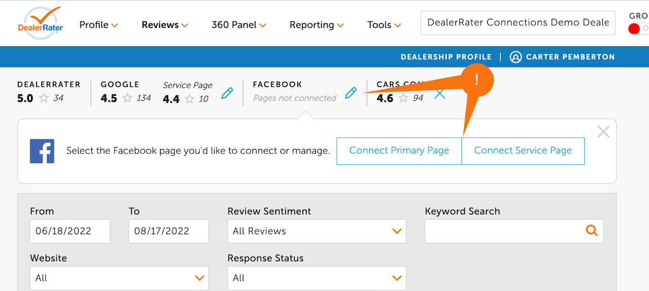 Connecting external platforms, like Facebook, to the Dealer Panel, allows you to respond to your reviews in one place. Below are step-by-step instructions on connecting your Facebook Page(s) to the Dealer Panel.