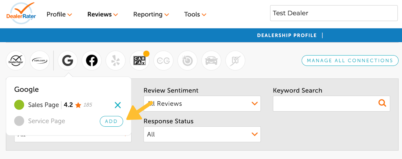Select the Google icon above the review filters section. From here, you can connect to your Primary dealership page or a Service Center page by selecting the 'Add' button.