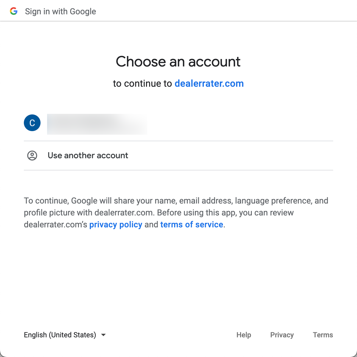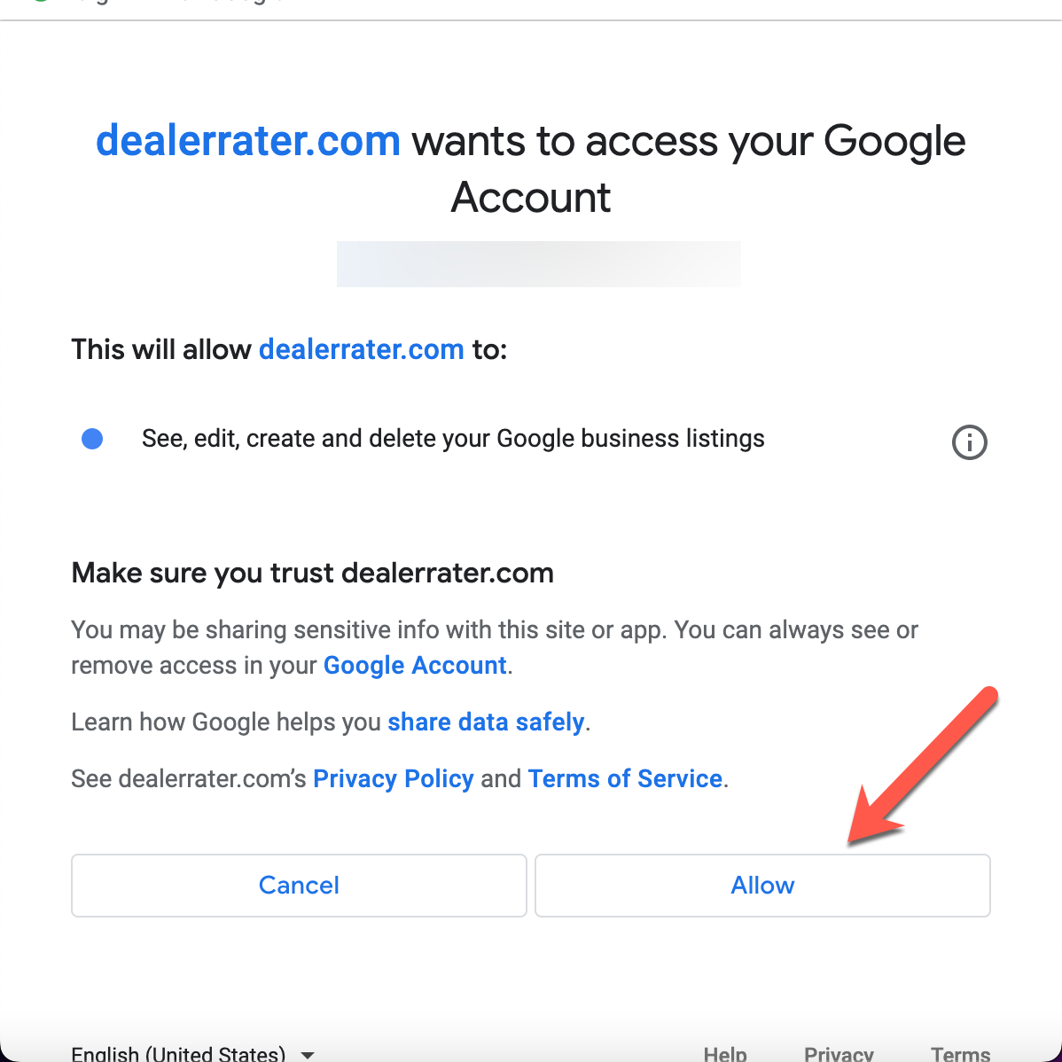 Google will ask you to give DealerRater permission to access your data.