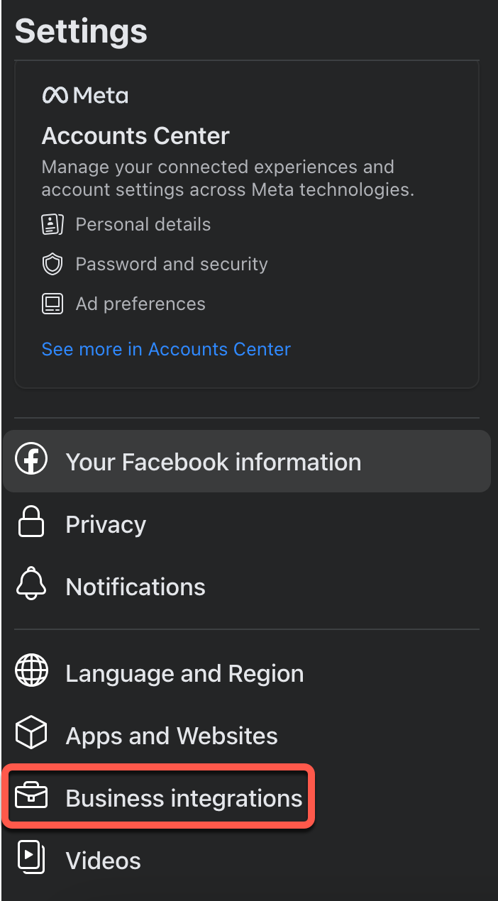 If you start the Facebook connection flow with an account that does not have access to your business pages and wish to sign in using a different account. You must remove the Business integration from the first account you signed in with. Once this is removed, sign into Facebook with the account you wish to connect to the Dealer Panel. Below are instructions on how to remove the Business integration.