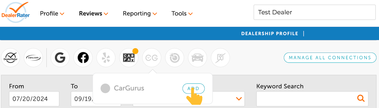 Integrating external platforms, such as Yelp and CarGurus, alongside your Cars Commerce Brands lets you manage all your reviews in one convenient location. Follow the step-by-step instructions below to set up review feeds from additional sources.