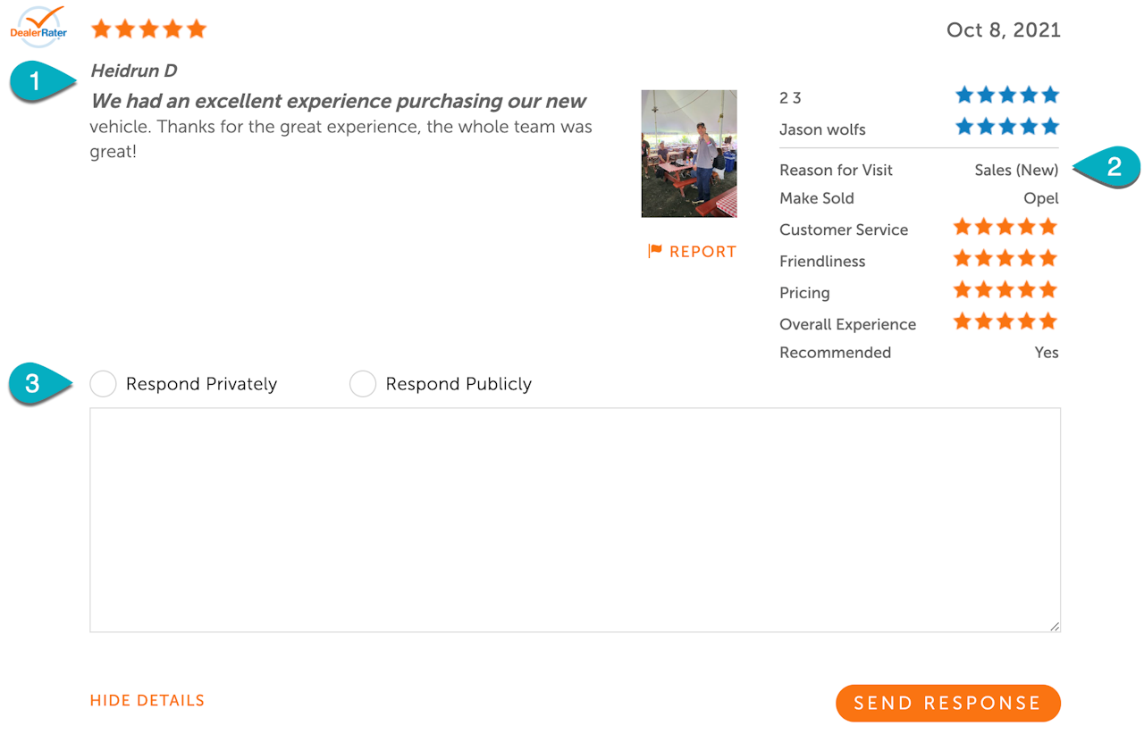 At the top of each review, you will see the overall review score and a description of the experience from the customer. If it is a LotShot review and a photo was included in the review, it is displayed to the right of the review description.