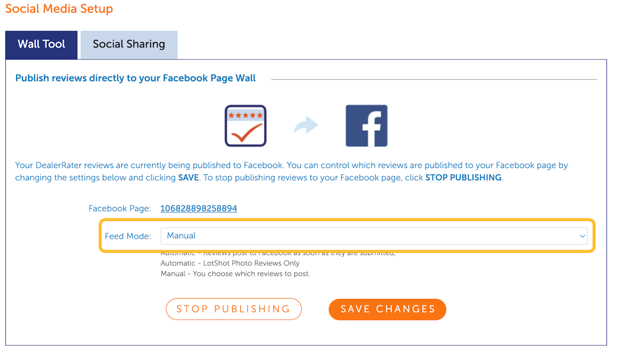 Automatic - The Wall Tool will automatically push a review to the connected Facebook page. When this option is selected, you can set a review rating threshold.