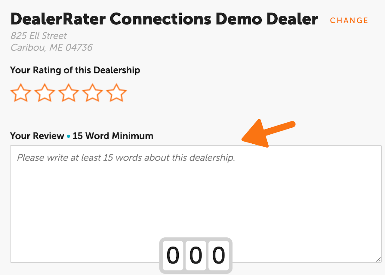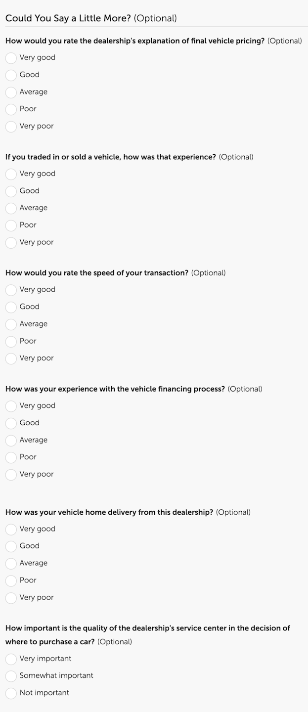 In the open form field, describe your experience with the dealership using 15 words or more.