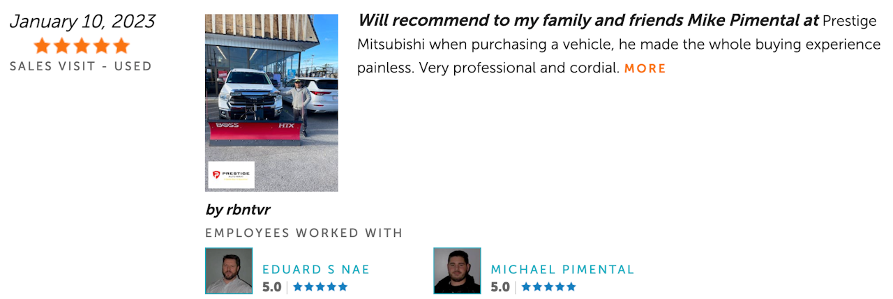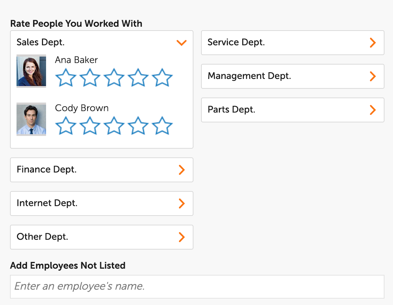 Next, rate each employee you worked with at the Dealership. If you want to rate an employee that is not listed, use the free form field to type the employees name.