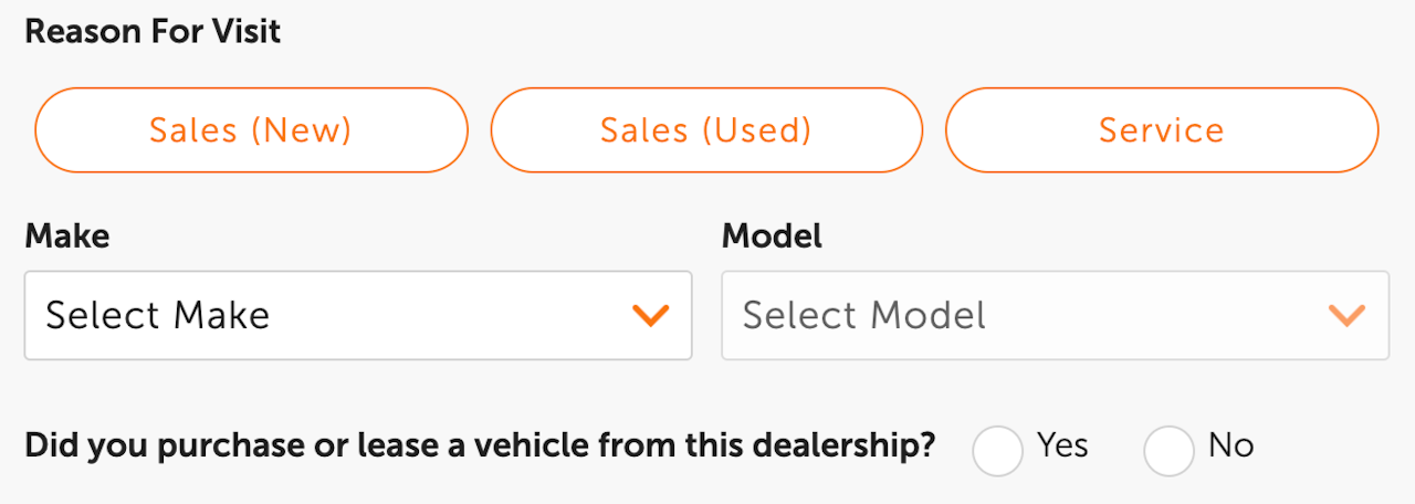 Specify your Reason for Visit: New Sales, Used Sales, or Service. Enter your vehicle information, including make and model, and indicate if you purchased or leased.