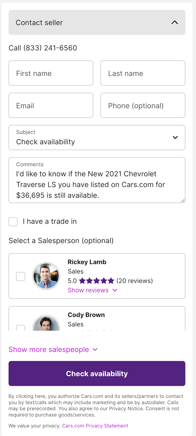 Salesperson Connect is included in the Cars.com Premium and Dealer Inspire website packages.